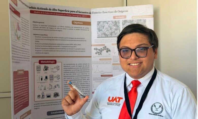 El alumno de la Escuela Preparatoria Mante de la UAT presentó con éxito su proyecto enfocado en la síntesis de nanopartículas de carbón activado, una línea de investigación aplicada al estudio de procesos asociados al cáncer.